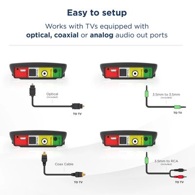 The transmitter is plugged into an electrical wall outlet or preferably your television’s USB port and into your television’s digital, 3.5 or RCA “audio out port”.
